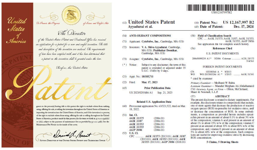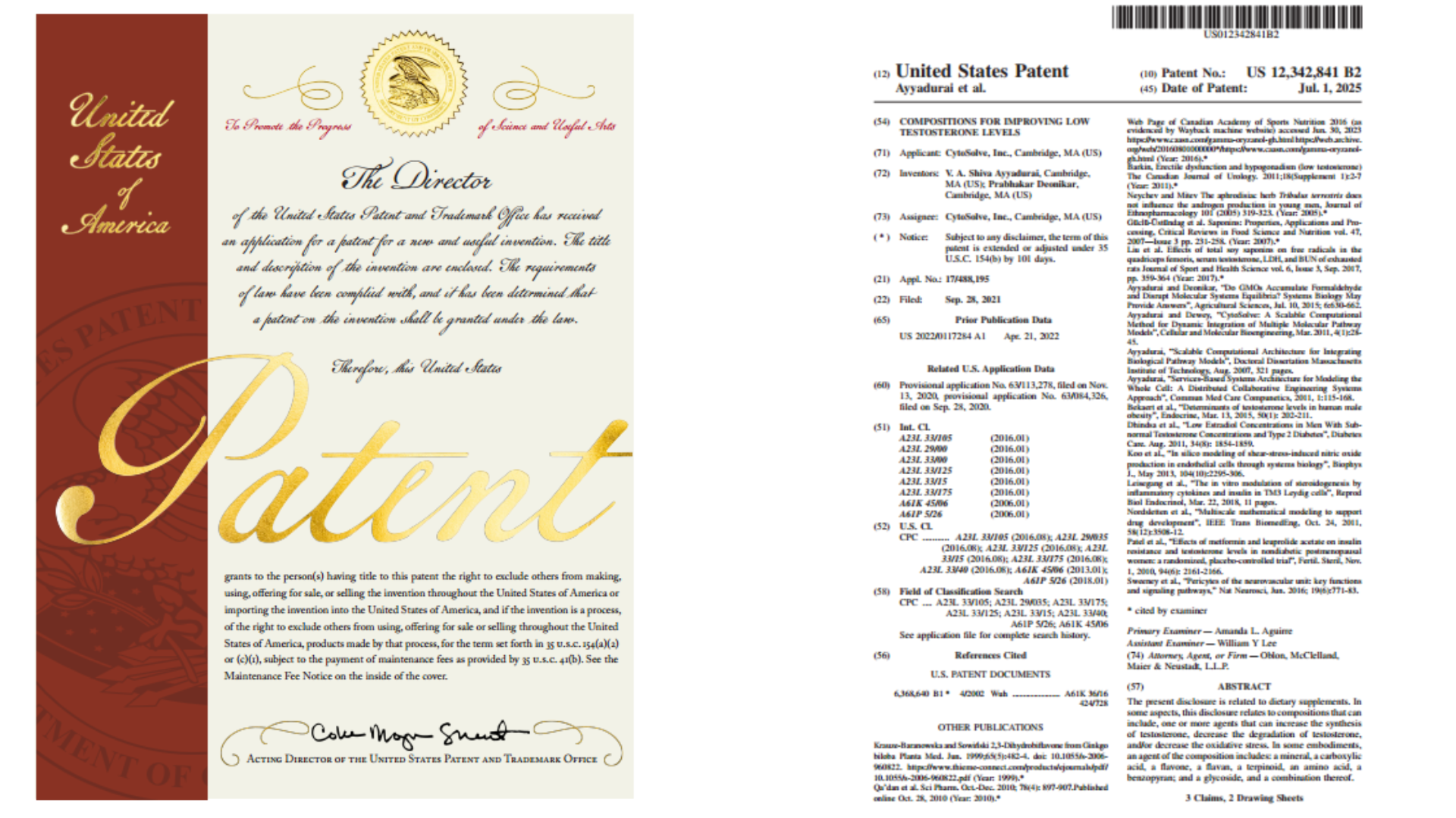 CytoSolve® has recently been awarded patents by the United States Patent and Trademark Office for its innovative work in Joint Health, Antioxidant Protection, Low Grade Inflammation, and Men’s Health.