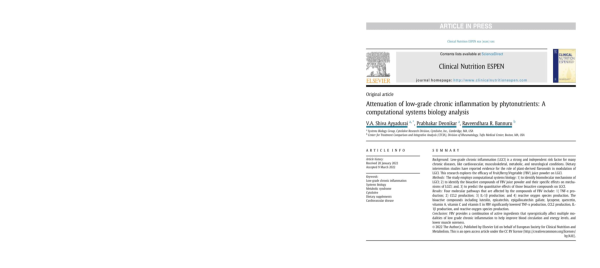 Low-grade chronic inflammation (LGCI) is a strong and independent risk factor for many chronic diseases, like cardiovascular, musculoskeletal, metabolic, and neurological conditions. Dietary intervention studies have reported evidence for the role of plant-derived flavonoids in modulation of LGCI. This research explores the efficacy of Fruit/Berry/Vegetable (FBV) juice powder on LGCI. FBV provides a combination of active ingredients that synergistically affect multiple modalities of low grade chronic inflammation to help improve blood circulation and energy levels, and lower muscle soreness. Download this pioneering and well-received journal article published “Clinical Nutrition ESPEN.” CytoSolve, Inc.,